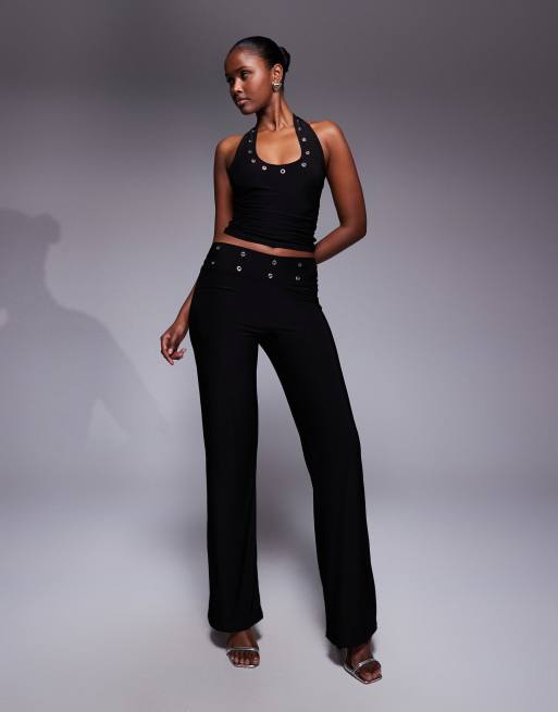 Kaiia exclusive premium soft touch eyelet detail waistband wide leg pants in black - part of a set