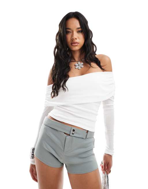 Kaiia exclusive textured off the shoulder fold detail long sleeve top in white