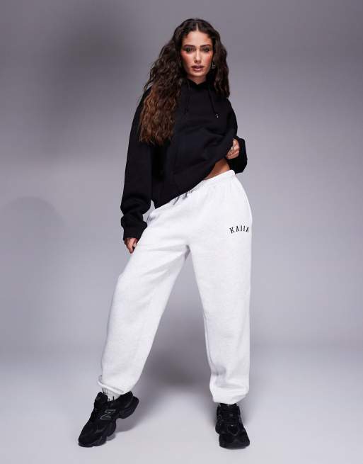 Kaiia Petite cotton blend embroidered logo cuffed sweatpants in light gray heather