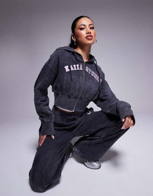 Kaiia Studio fitted zip up hoodie and straight leg sweatpants in washed gray and pink - part of a set