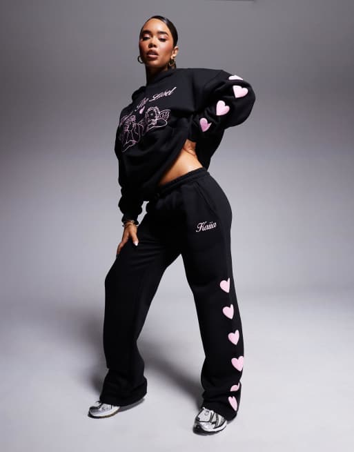 Kaiia wide leg logo sweatpants in black and pink puff heart print - part of a set