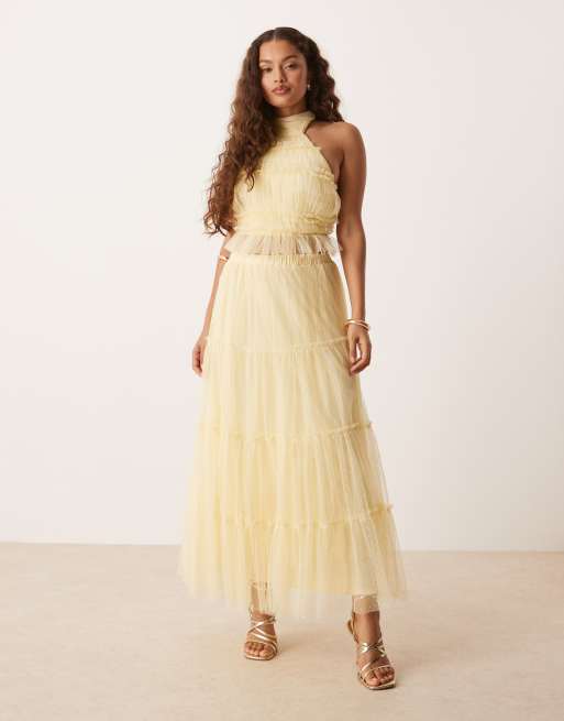 Lace & Beads Petite tiered ruffle maxi skirt in lemon - part of a set
