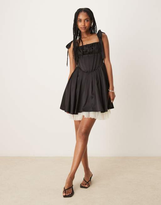 Lace & Beads bow shoulders corset tulle mini dress in black