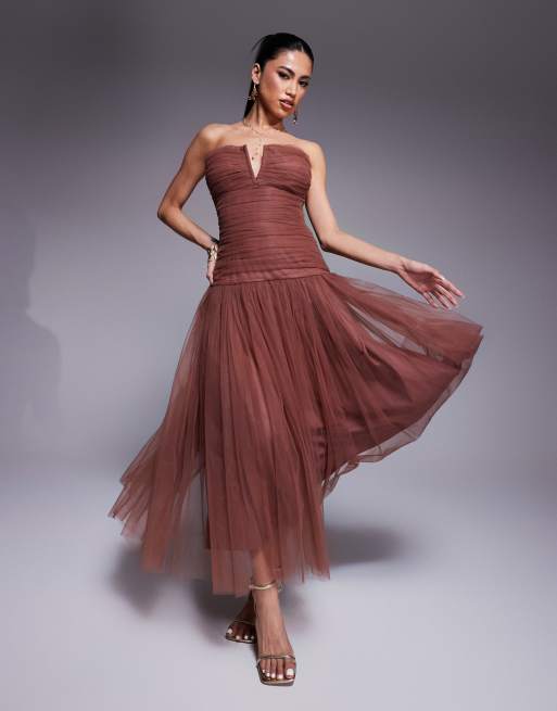 Lace & Beads drop hem tulle maxi dress in rose brown