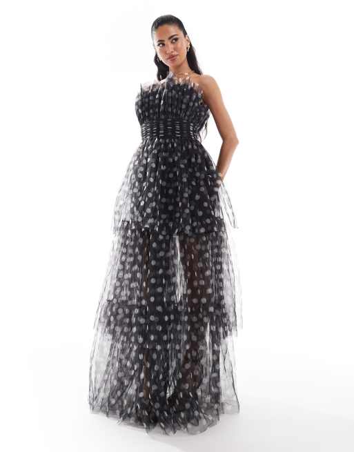 Lace & Beads high low tulle maxi dress in black polka dot