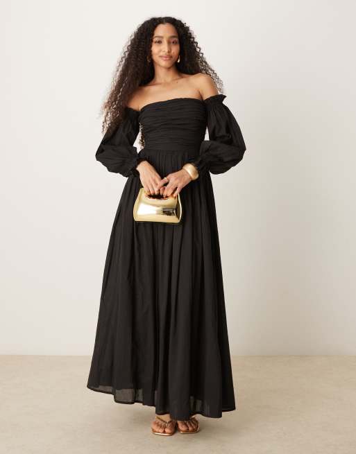 Lace & Beads off the shoulder balloon sleeves cotton maxi dress in black