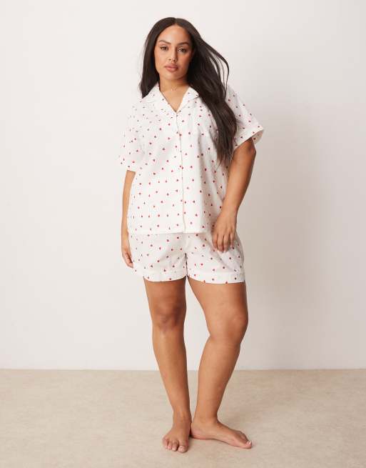 Loungeable Curve heart printed textured short sleeve shirt & shorts pajama set in ivory