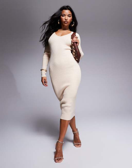 Lulus long sleeve rib knit sweater midi dress in cream