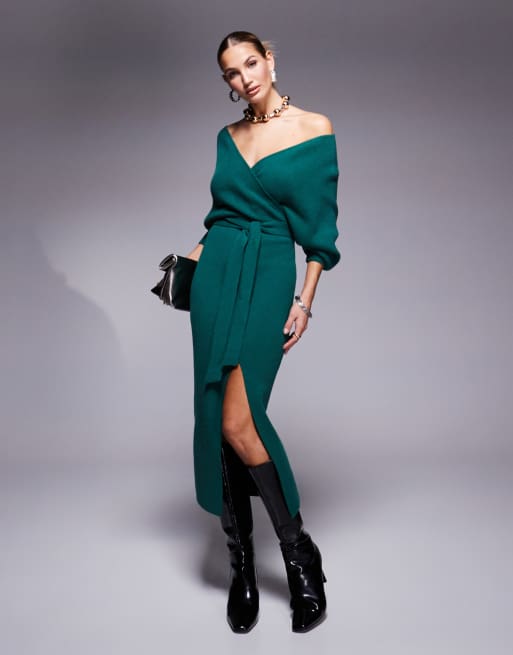Lulus off shoulder knit midi dress in forest green