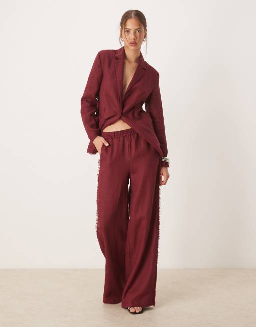 Mango 100% linen frayed edge fitted blazer & pants set in dark red