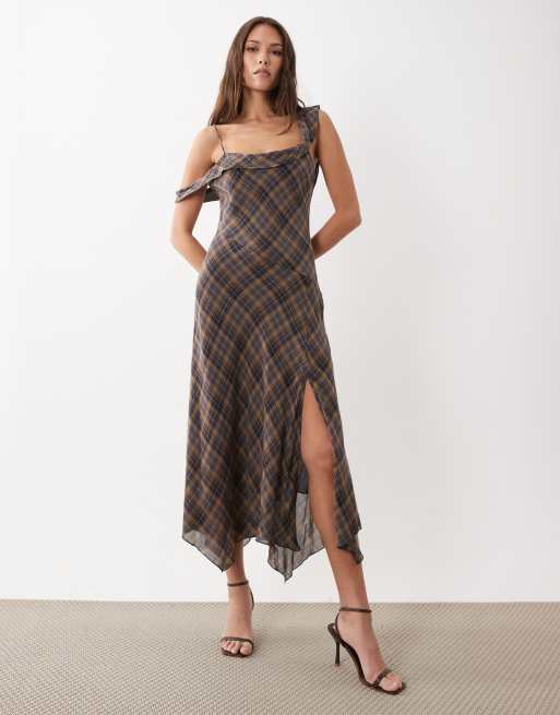 Mango cowl neck hanky hem maxi dress in brown plaid
