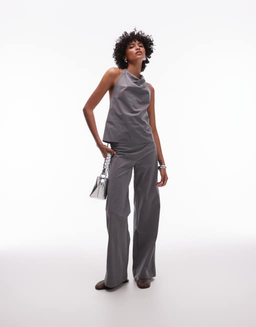 Mango drape neck open back bengaline top and straight leg pants set with hoop detail closure in gray