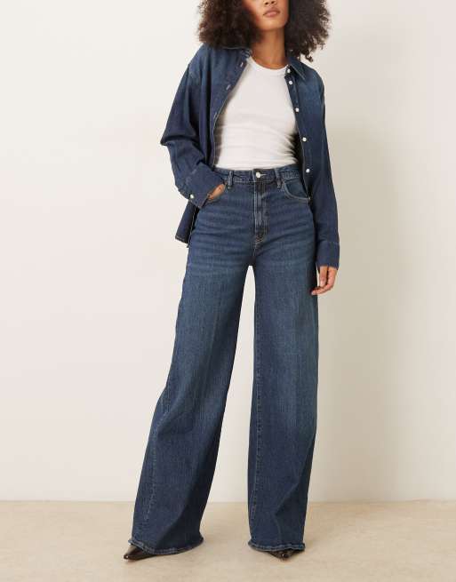 Mango Elise cotton mix pleat front wide leg jeans in dark blue