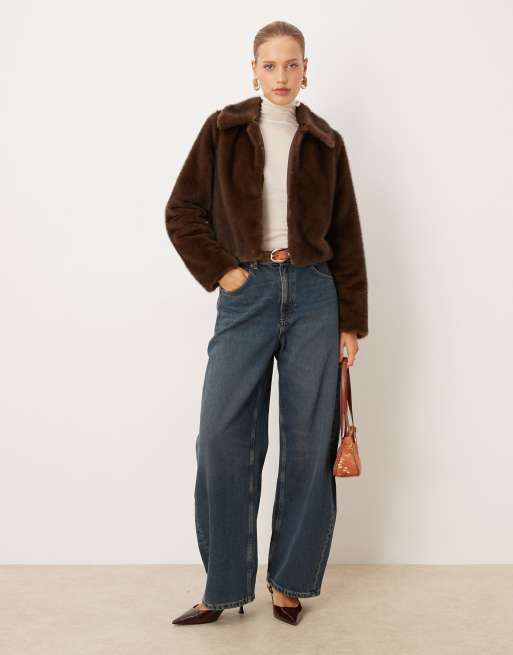 Mango faux fur zip up jacket with collar in brown