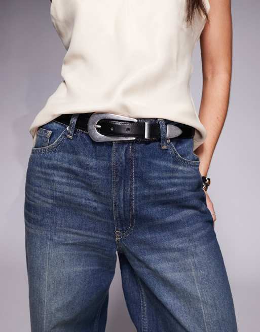 Mango featuring Kaia Gerber 100% leather slim belt with silver buckle in black
