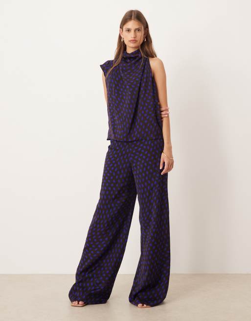 Mango halterneck satin top & pants set in brown polka dots