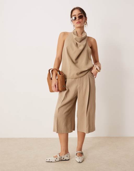 Mango longline loose fit pleat front shorts and draped halterneck blouse set in beige