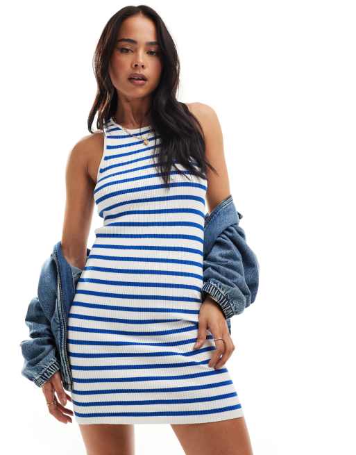 Mango mini stripe jersey dress in white and blue