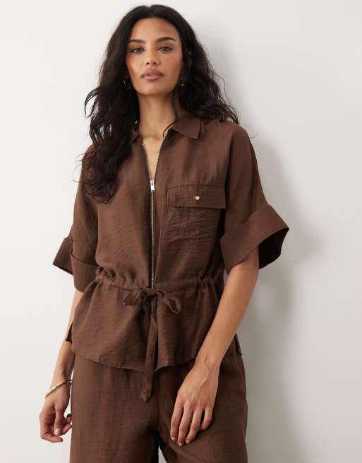 Mango Safa linen mix short sleeve tie waist jacket in brown - part of a set
