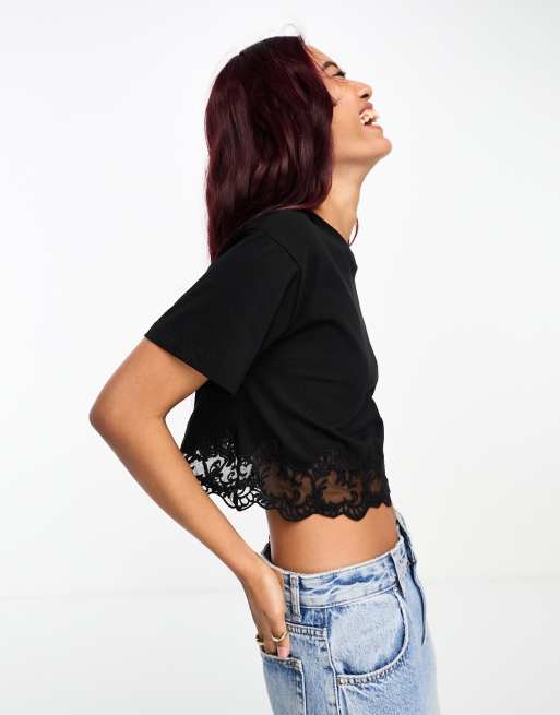 Miss Selfridge boxy short sleeve crop top with lace hem in black