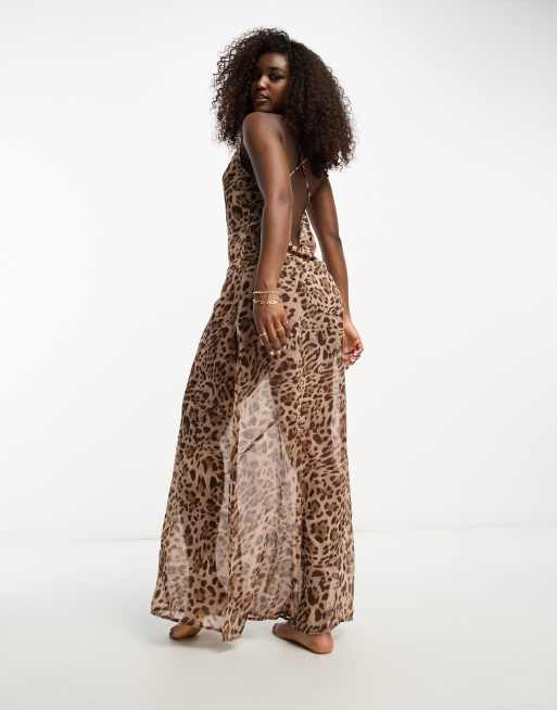 Miss Selfridge cross back cowl neck maxi beach dress in leopard print