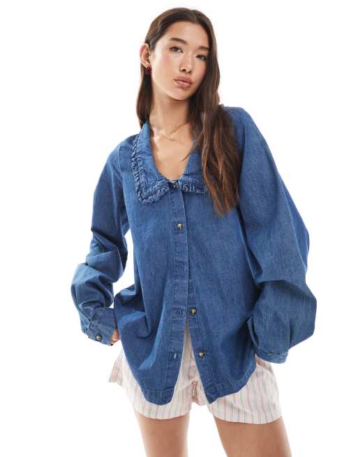Miss Selfridge denim ruffle collar shirt in mid wash