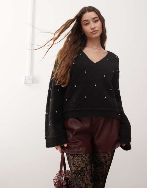 Miss Selfridge diamond pattern embellished wide sleeve sweater in black