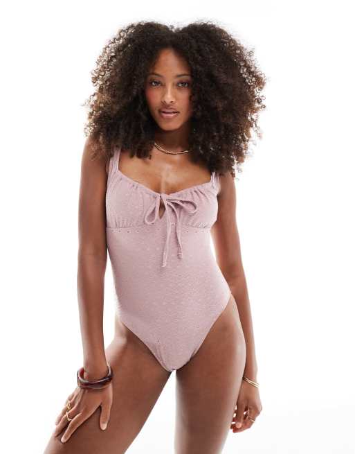 Miss Selfridge eyelet texture swimsuit with tie front in dusky pink