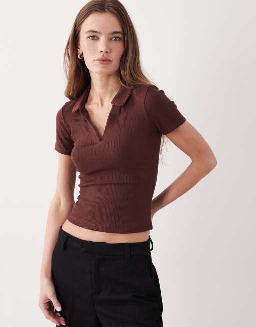 Miss Selfridge fitted rib knit polo top with picot stitching in chocolate