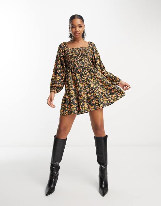 Miss Selfridge long sleeve shirred puff sleeve mini dress in ditsy
