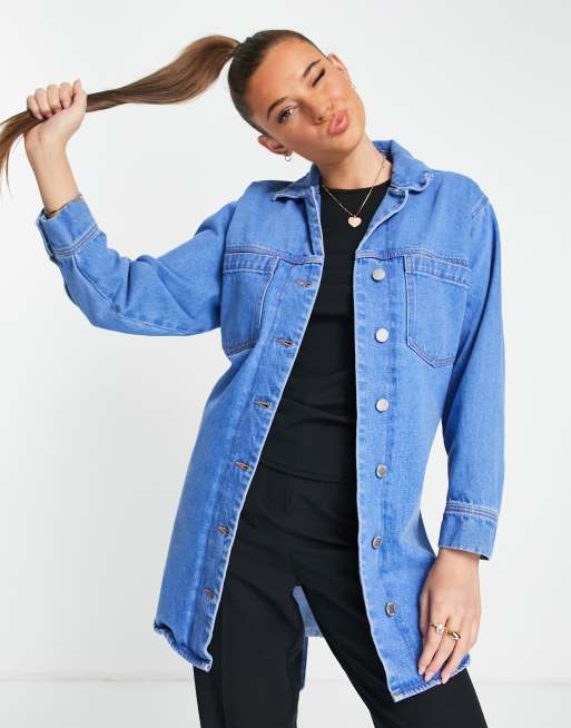 Miss Selfridge longline belted denim jacket in midwash blue