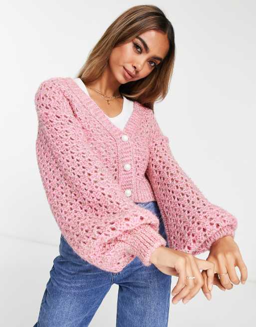 Miss Selfridge metallic open knit cardigan with pearl buttons in pink