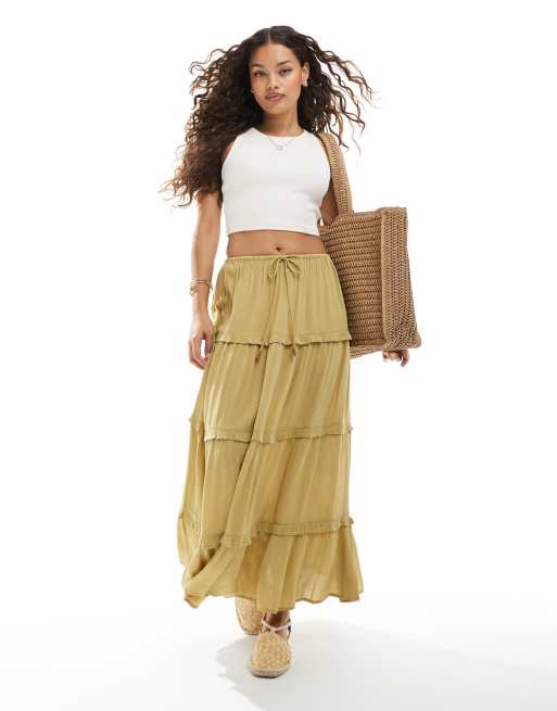 Miss Selfridge Petite tiered maxi skirt in light khaki green