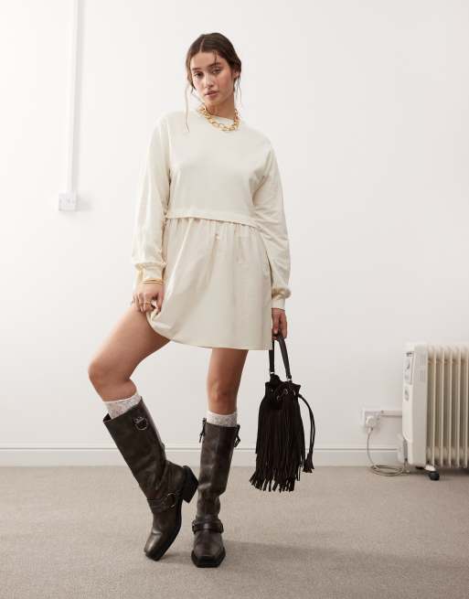 Miss Selfridge poplin and jersey mix smock dress in buttermilk