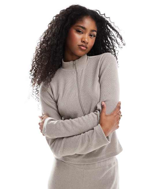 Miss Selfridge soft touch rib half zip top in mushroom - part of a set