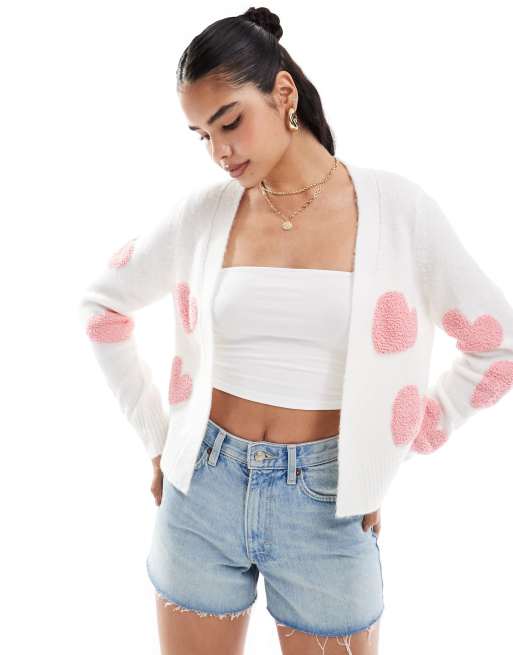 Miss Selfridge textured heart cardigan in cream with pink hearts