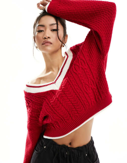 Miss Selfridge varsity crop sweater in red with contrast tipping