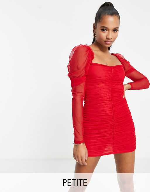 Missguided Petite ruched mesh mini dress with long sleeve in red