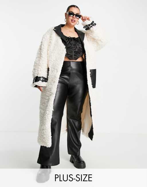 Missguided Plus faux leather trim oversized teddy coat in cream