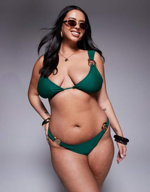Moda Minx Curve tie side bikini bottoms with gold hardware details in green