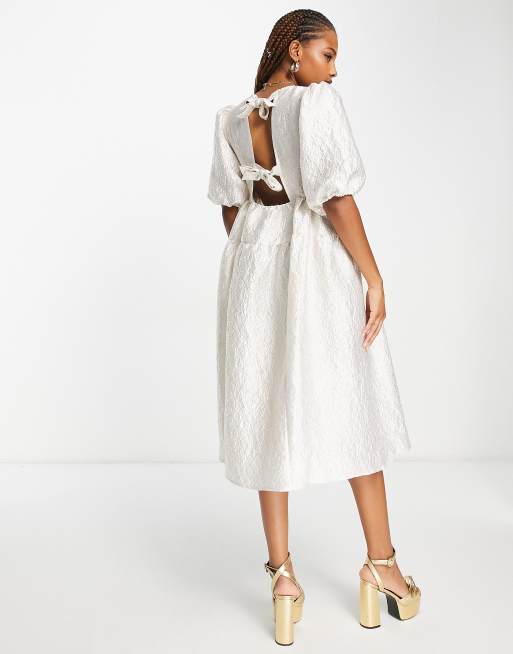 Monki midi puff sleeve dress with cut out bow back in silver