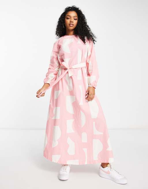 Monki poplin tie waist maxi dress in pink print