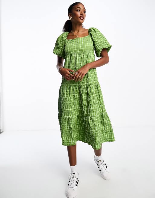 Monki tiered midi smock dress with puff sleeves in green check