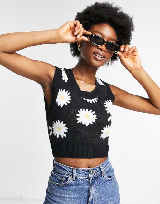 Monki Zen recycled daisy knit sweater vest in black