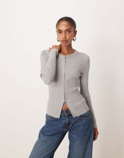 Motel Liano ribbed long sleeve zip up cardigan in gray