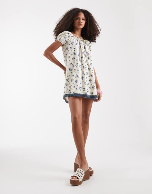 Motel Marlowe ditsy leaf rose milkmaid dress in light gray