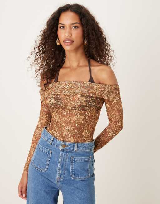 Motel nanila lace off the shoulder long sleeve top in brown