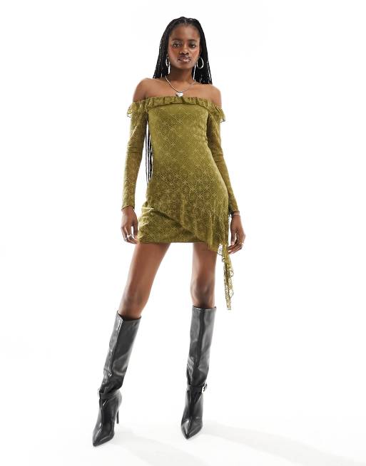 Motel ruffle off shoulder textured lace mini dress in moss green