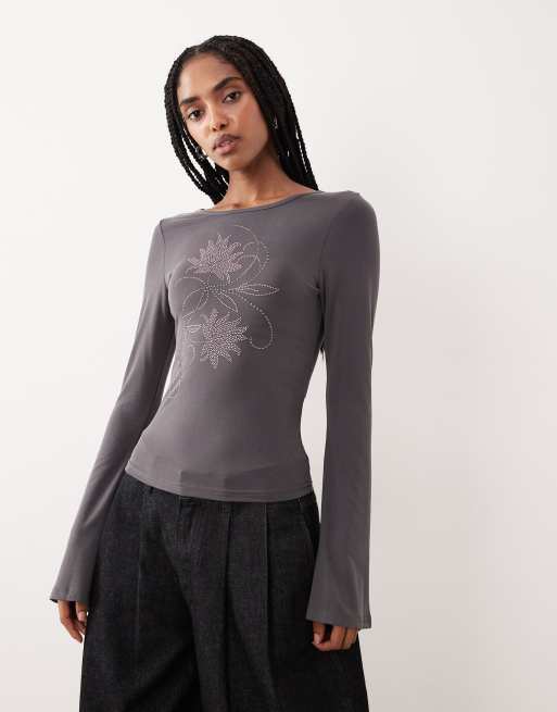Motel Tiyana flared long sleeve flower diamante detail top in gray