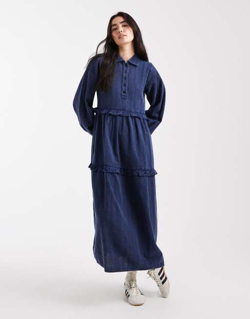 Native Youth textured stripes washed ruffle midaxi dress in navy
